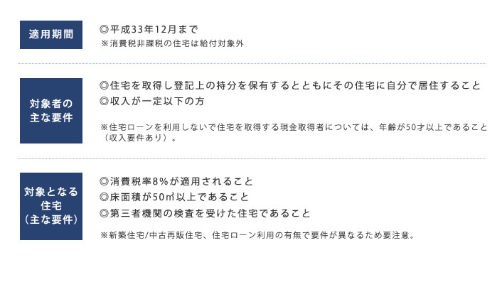 「すまい給付金」は、消費税率引上げによる住宅購入者の負担を緩和するために導入された制度です。先にご紹介した「住宅ローン減税」は、支払っている所得税等から控除する仕組みであるため、収入が低いほど減税効果が小さくなります。
