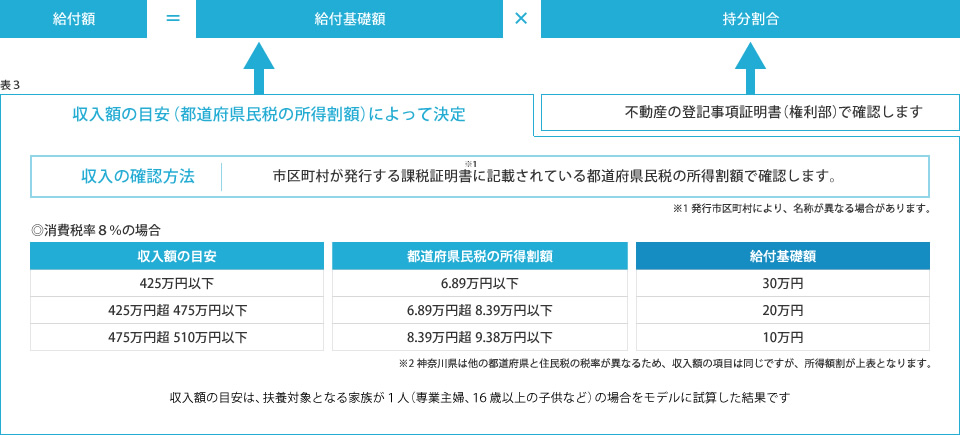 すまい給付金の給付額は、上記の計算式できまります。住宅ローン控除のように「借入残高の1%」という形式ではなく、「給付基礎額」は、10万円・20万円・30万円の3種です(消費税率8%の場合)(表2参照)。