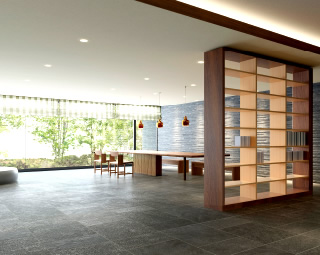 このシャリエ阿部野阪南町レジデンスでは、建物全体のデザイン監修を担当させていただきました。エントランスに続くラウンジは、長さ4メートル強のビッグテーブルや天井に届くブックシェルフを配してライブラリーのような雰囲気とし、目に美しいばかりでなく居心地の良いラウンジとして寛いでいただける空間としています。