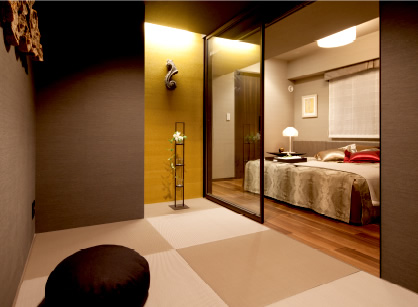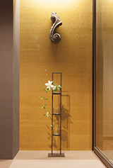 モデルルームでは、座敷の床壁に金箔風の壁紙を用いています。谷崎純一郎の「陰影礼讃」にもありますように、金色は家屋の奥の薄暗い場所に在ってこそ際立つようです。 日本の伝統的な美意識の中には奥深い金への憧れがみられます。また近年では、インテリアのワールドトレンドにもゴールドの復活が見られます。たとえば日本でも根強い人気の北欧インテリア。白とナチュラルウッドとシルバーのスキームがイメージされますが、現地ではかねてよりコパー(銅)やブラス(真鍮)が実に上手く使われていて、空間に温かみと豊かな表情をもたらしています。昨今は日本でもインテリアショップなどにゴールド色のオーナメントが増えました。ほんの少しのゴールドが、部屋のイメージを変えてくれます。