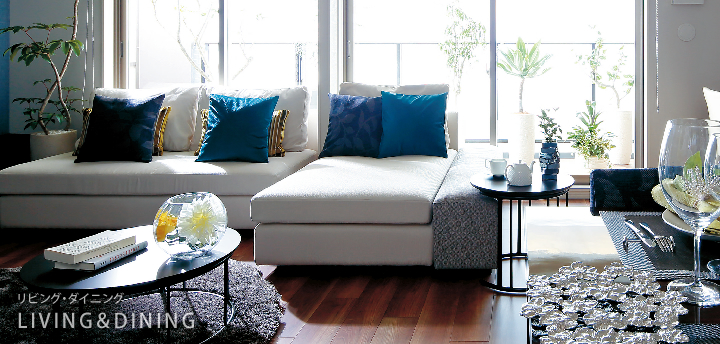 リビングは、ミディアムブラウンのフローリングに対して、ボリューム感のあるソファにアイボリーを使うことで、室内が明るく爽やかなイメージになります。アクセントカラーは、アイボリーに映える鮮やかなブルーとグリーン。一方、テレビを置いた壁面はダークグレーの天然石を貼ることで、重厚感のある落ち着いた空間になりました。壁面と天井に配した間接照明の光が、室内を柔らかく照らします。