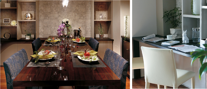 リビングに続くダイニングのテーブルは、シックなダークブラウン色。壁一面にディスプレイシェルフ(「飾り」棚)を設えました。棚板から壁面に向けて「間接」照明を入れることで、棚の奥行き感を出しています。モダンなインテリアの空間には、グリーンやお気に入りの小物を置くことで、より居心地良く過ごせるでしょう。リビング・ダイニングの一部にはデスクコーナーを設け、家事をしながら、勉強をするお子さまを見守ることができます。