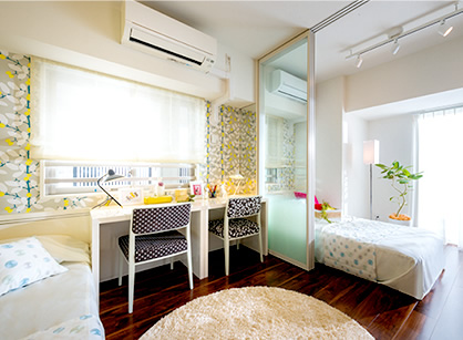 子ども部屋はお子様二人でお使いになることを想定しています。お二人が小さいときには机を並べてガラスの仕切り戸は開放し、ひとつの空間として共有スペースに。お子さまの成長に合わせて、空間をふたつに分割すれば、それぞれのプライベート空間としてお使いいただけます。