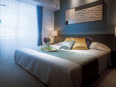 主寝室はウール100%のカーペットや和紙素材の壁紙、天然木のアートなど、自然素材にこだわった上質な空間です。さらに、玄関では珪藻(けいそう)土の塗り壁とミラーを組み合わせるなど、モダンな中にも自然を感じられるインテリアを心がけました。珪藻土は、調湿性能や消臭性能など、機能的にも優れた素材です。