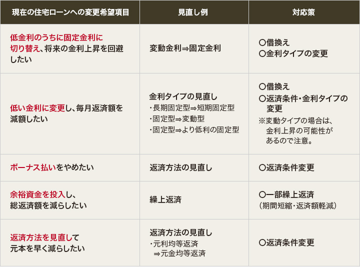 変更したい条件や見直したい項目をピックアップします。例えば、「世の中の金利が下がっているので自分の住宅ローン金利も下げられないだろうか」、「金利が上昇しそうなので、今のうちに固定金利へ変更したい」、「毎月返済額を減額したい」、「返済期間を短くしたい」など。希望条件やその優先順位によって、見直しプランも異なります。