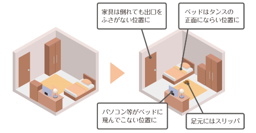 地震保険で備えることに合わせて、日頃からの備えも大切です。災害時に心配なのは家族の安否です。家族との連絡方法や集合場所の確認、避難先の確認を共有しておきましょう。近年発生した地震では、ケガをした人の約半数が家具類の転倒、落下、移動が原因でした。家具や電化製品をしっかり固定すること。ベッドやソファとの位置関係や、出口を塞がないような配置も重要です。古いマンションの場合は耐震診断を受けることもよいでしょう。マンションの管理組合での取り組みなども是非確認し、管理組合の活動にも積極的に参加してください。「備えあれば憂いなし」です。自分と家族の豊かな暮らしのために、我が家の“まさか”に備えましょう。