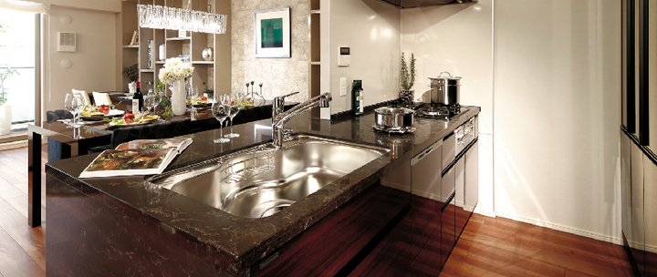 キッチンでは、デッドスペースになってしまうダイニング側のキッチン天板の下に収納を設置し、ガラス扉にしたことで、圧迫感を感じられないようにしています。食器棚は、天井までの高さにすることで十分な収納量を確保しました。炊飯器などの調理器具はキッチン天板より低い位置に設置、引き出し式の棚板を採用しましたので、リビング・ダイニング側から見た場合にも、スッキリした印象です。