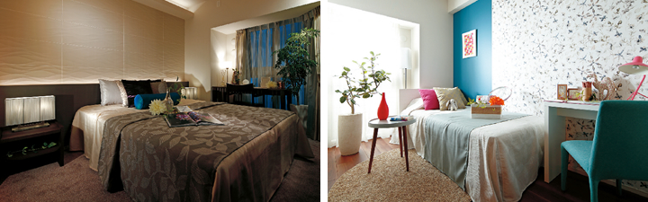 主寝室は、落ち着いたダークブラウンのカーペットを敷き、壁には波状の凹凸があるタイルをあしらい、ナチュラルな雰囲気に。ベッドヘッドからの光が、壁面の波模様を照らし出します。