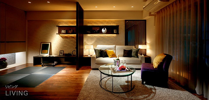 リビングに続くスペースは和のしつらえ。縦桟の仕切りとフローリングの床に配した琉球畳が、モダンな和空間を演出しています。この落ち着いた一角は、書斎としてお使いいただくことをイメージしました。和室の収納スペースとなる押し入れの戸には東レ「エクセーヌ®」を採用しましたので、モダンな中にも起毛素材の布にぬくもりを感じていただけるかと思います。
