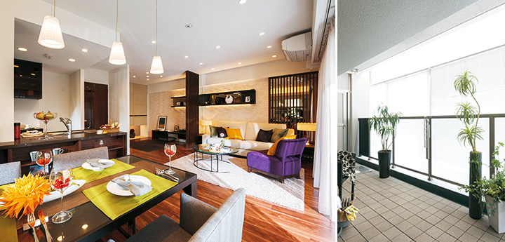 広い開口部を活かしたリビング・ダイニングは、自然の光に満ちた、明るい空間です。広々としたバルコニーには東レ・アムテックス「トレクール®」というタイルを使用しています。透水性に優れているので水たまりができにくく、適度な保水性により、夏には打ち水の冷却効果も期待できます。